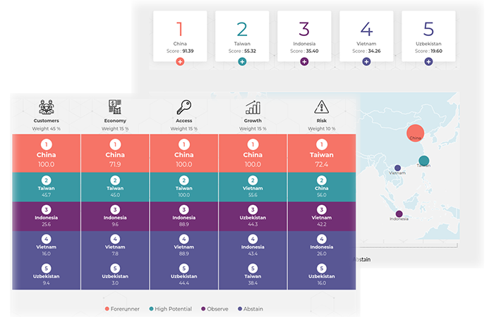 Discover the most promising markets through our tailored guidance for leading countries. Save time and accelerate your international development with our user-friendly Market Ranking report, providing quick access to valuable insights. Choose from 5, 10, or 20 countries of interest, and let us tell you the top markets for your business.